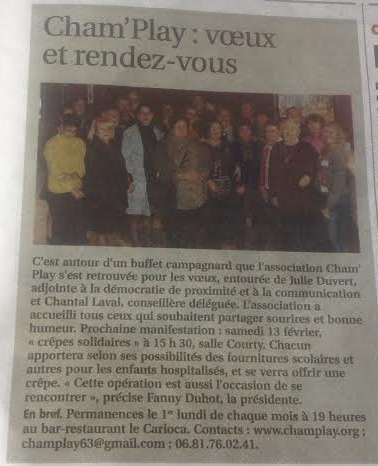 16 janv. 2016On se donne rendez-vous le samedi 13 février à 15h30 à la salle Courty, pour les "crêpes solidaires", chacun amènera des fournitures pour les enfants hospitalisés, coloriages tous âges, crayons de couleurs et/ou feutres tous âges, décalcomanies, gommettes, etc... et se verra offrir une crêpe et partagera un beau moment de convivialité !!!